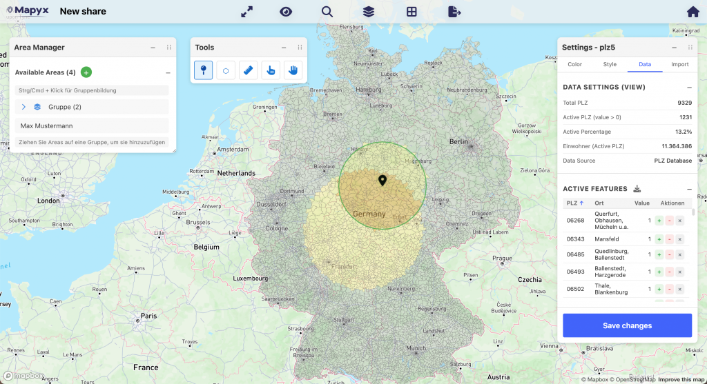 Mit Mapyx erstellst Du eigene Karten ganz intuitiv – direkt durch Klick auf die gewünschten Postleitzahlenbereiche oder per Auswahl aus Deinen Daten. Ob einzelne Regionen, komplette Vertriebsgebiete oder individuelle Einzugsgebiete: Du definierst mit wenigen Handgriffen genau die Flächen, die für Dich relevant sind.